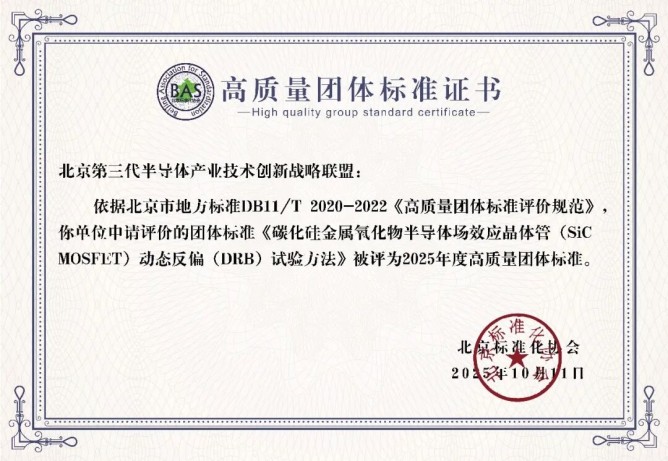 第三代半導體產(chǎn)業(yè)技術創(chuàng)新戰(zhàn)略聯(lián)盟發(fā)布的T/CASAS 046—2024《碳化硅金屬氧化物半導體場效應晶體管(SiC MOSFET)動態(tài)反偏(DRB)試驗方法》團體標準,被評為2025年度高質量團體標準。